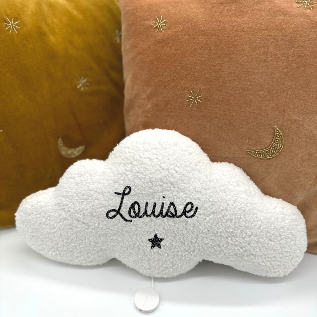 Jolie veilleuse musicale Nuage personnalisable au prénom de votre enfant avec le coloris flex de votre choix (argent, noir, blanc ou doré) Avec sa lumière et sa douce mélodie, elle saura apaiser vos enfants et veiller sur leurs nuits.