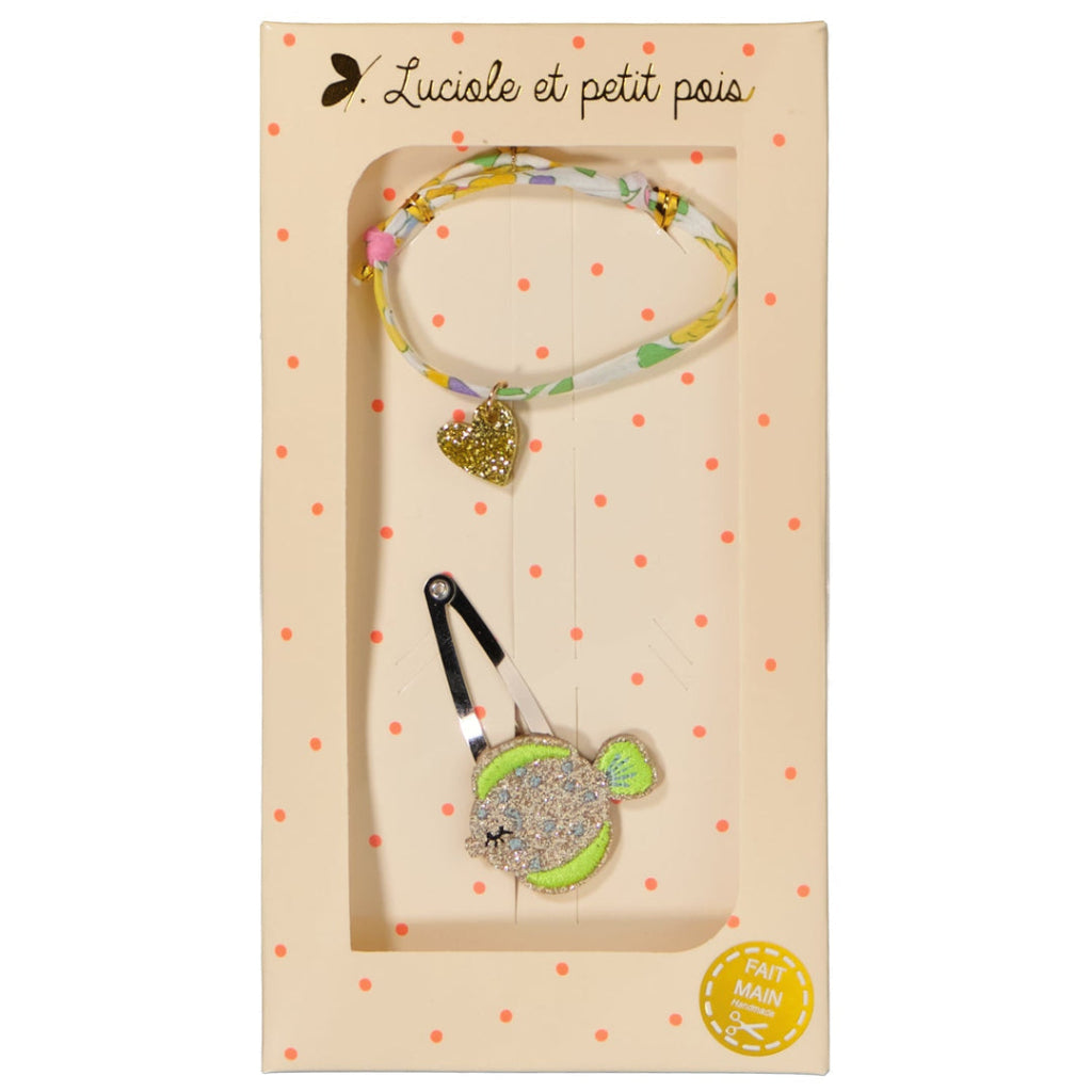 Découvrez ce coffret cadeau adorable, comprenant une barrette poisson à pois et un bracelet Liberty Betsy mimosa ! Un duo plein de peps et de couleurs pour égayer les tenues d'une petite fille avec une touche de fantaisie marine.