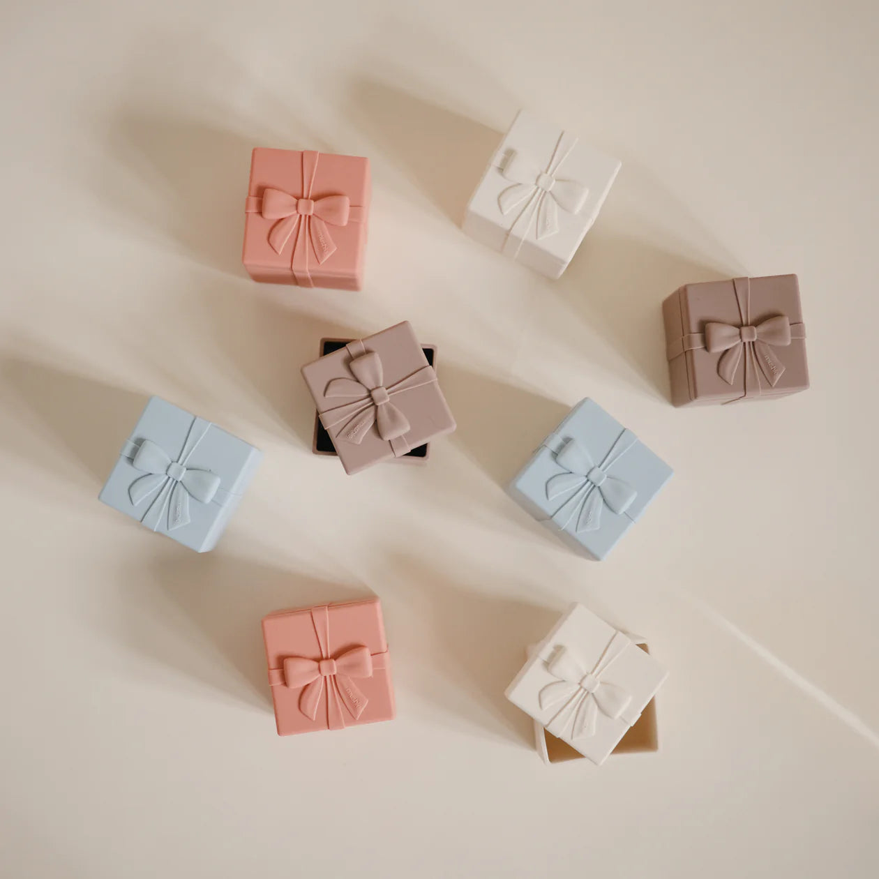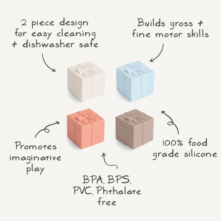 Chaque boîte colorée est dotée d'un couvercle amovible, permettant aux enfants d'intervertir les couvercles et de composer leurs propres cadeaux. Fabriqués en silicone souple et non toxique, ces jouets sont parfaitement adaptés aux petites mains et encouragent le jeu créatif tout en développant la motricité fine et en apprenant les couleurs.