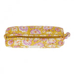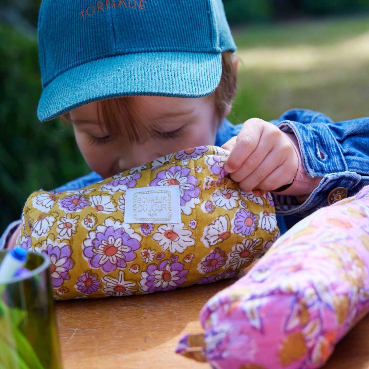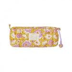 Imprimée à la main avec des tampons de bois grâce à la technique artisanale du block print, chaque trousse raconte une histoire. On aime ses couleurs douces, son tissu moelleux et son joli pompon fait dans le même tissu.