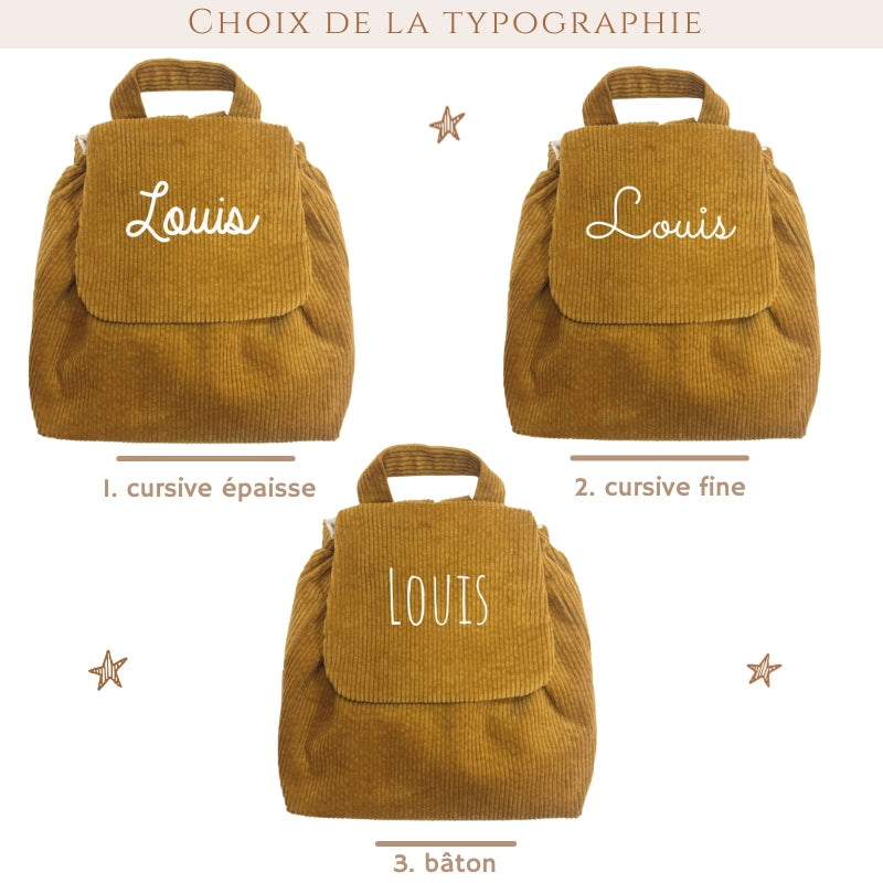 Sac à dos en velours côtelé moutarde personnalisable avec le prénom de votre enfant. Idéal pour la crèche ou l'école maternelle, il est équipé de bretelles réglables et d'une ouverture à scratch.