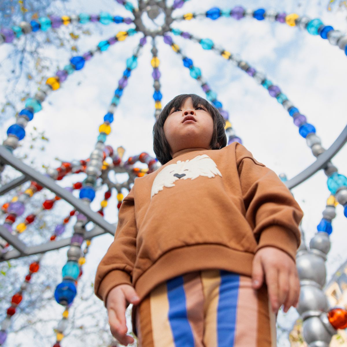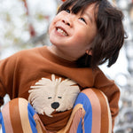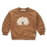 Ce sweat-shirt moka en 100 % coton biologique est brossé à l’intérieur pour offrir un confort tout doux. Il est orné d’un grand imprimé original représentant un chien à moustaches, créé en collaboration avec « Gisele et Rose ». Un modèle unique, tendance et plein de caractère.