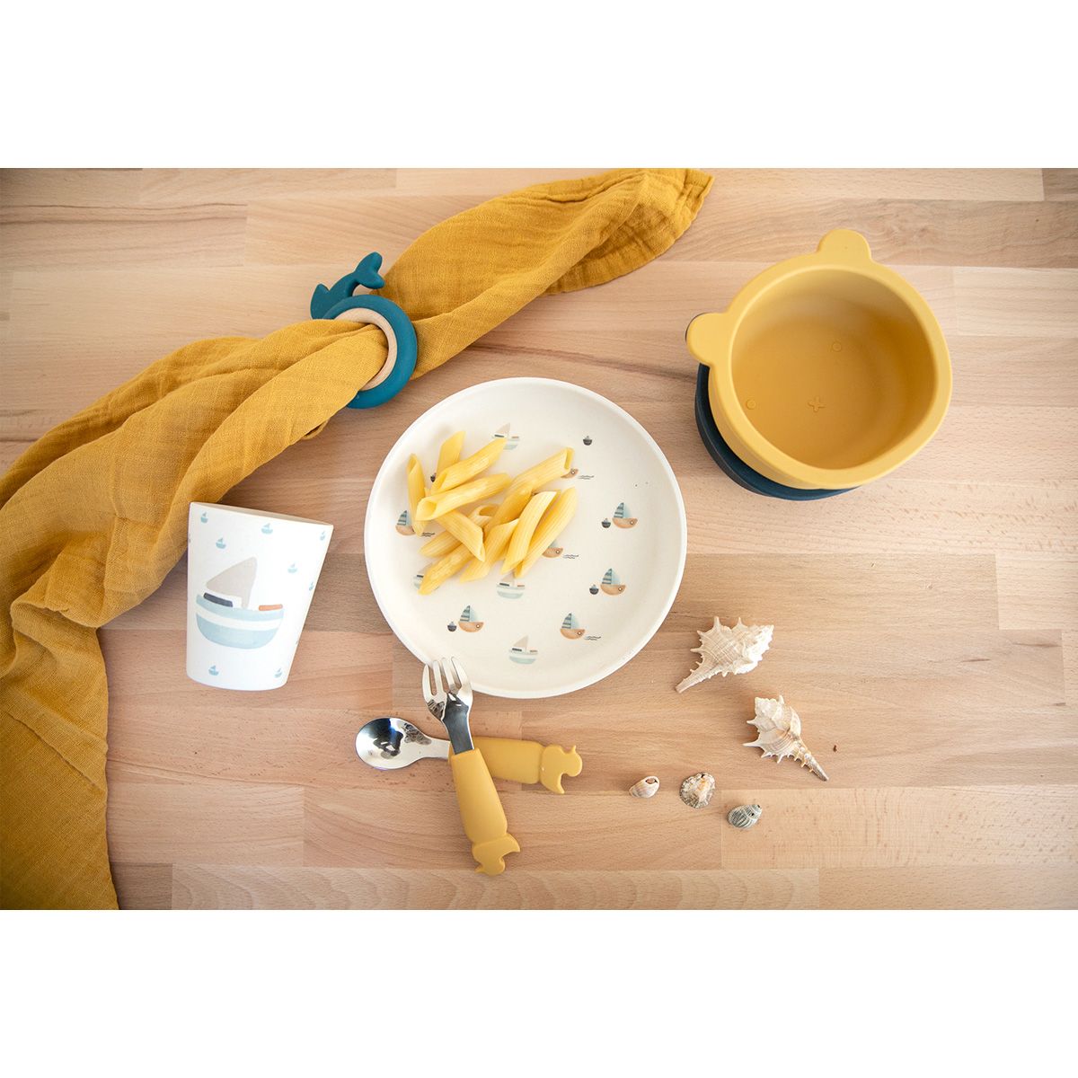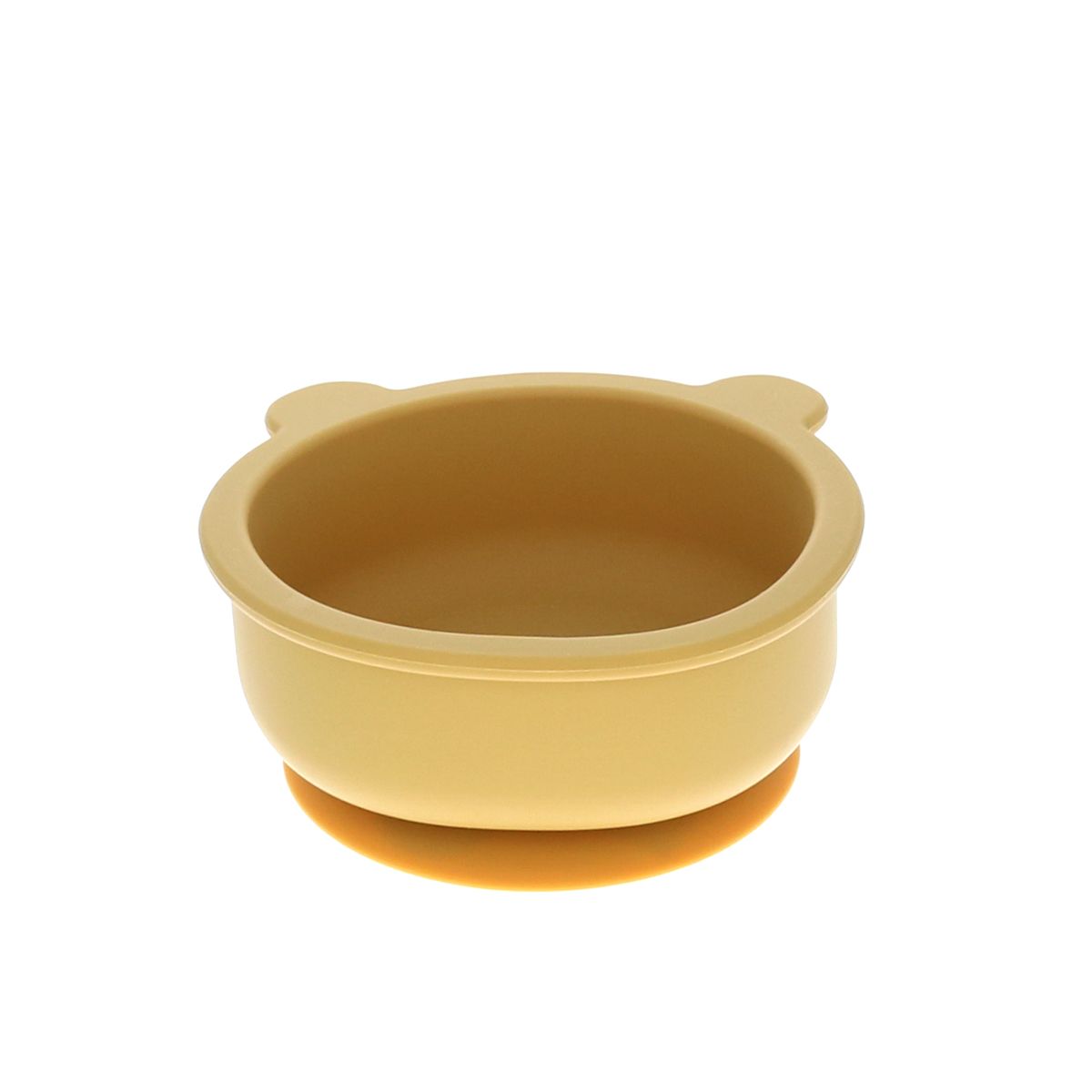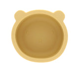 Pour manger, ce petit bol en forme d'ours couleur jaune moutarde. En silicone, il est facilement nettoyable. Pratique, il dispose d'une ventouse pour bien adhérer à la table.