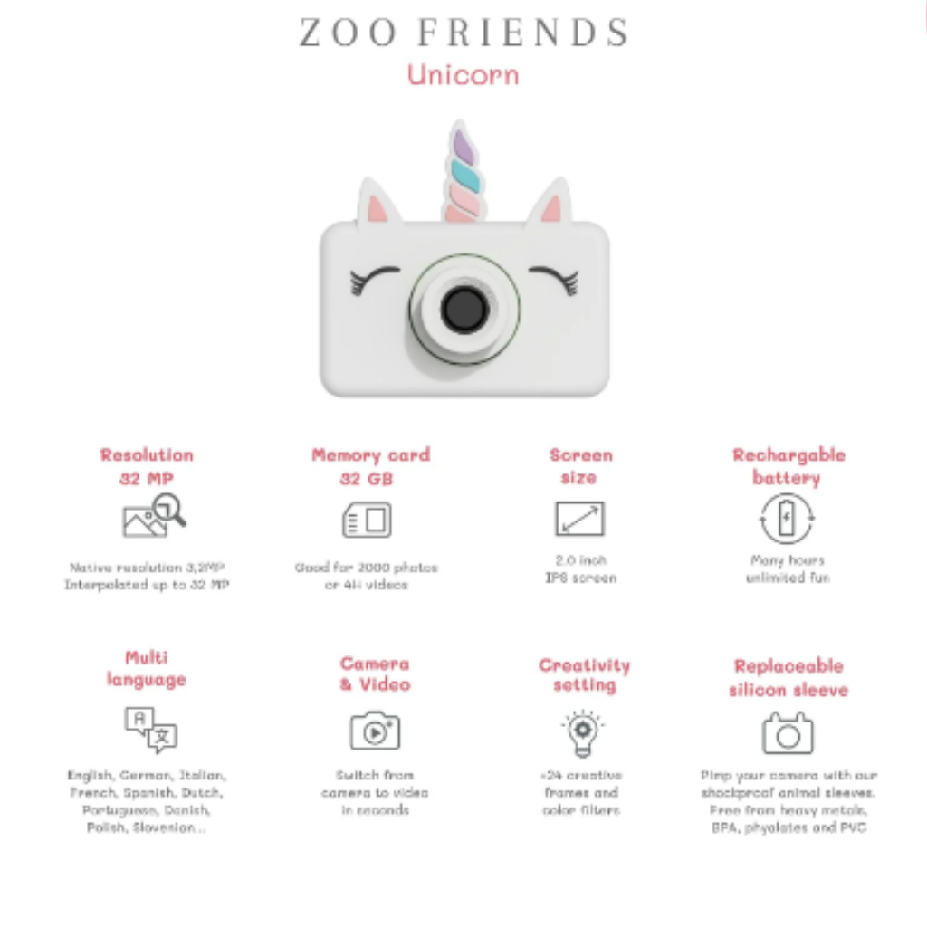Cet appareil photo numérique de 32 mégapixels pour enfants au design d'une licorne et enregistreur vidéo de The Zoofamily est petit et légèr. La housse en silicone n'est pas seulement mignonne, elle protège aussi contre les chutes et garde l'appareil photo propre. Elle peut être facilement enlevée et lavée. Grâce à sa batterie rechargeable intégrée, elle peut fonctionner pendant des heures avant d'être rechargé. Entièrement chargé, elle peut prendre plus de 2000 photos ou enregistrer environ 4 heures.