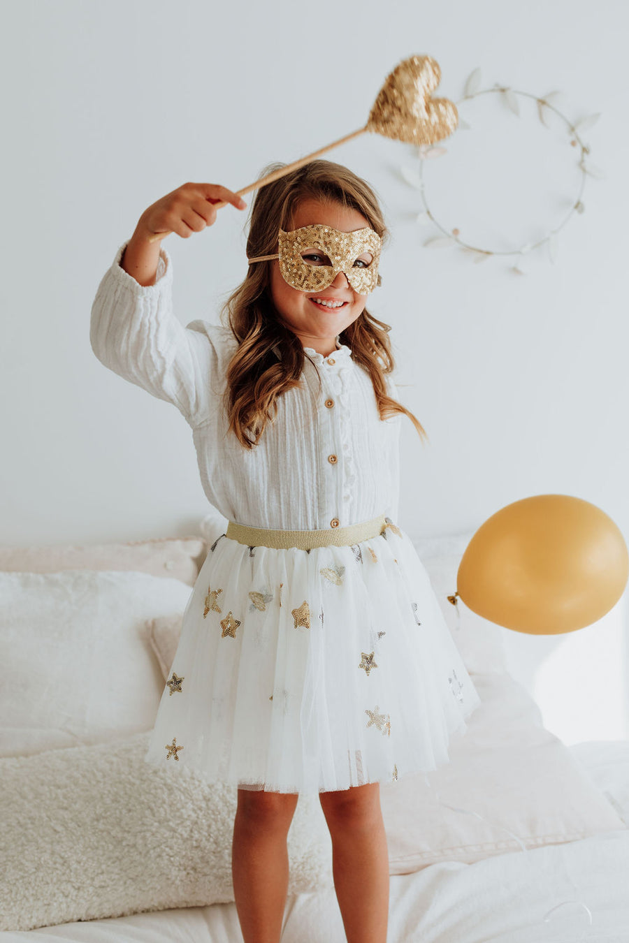 Le masque en sequins or s'associe facilement avec ses déguisements. La voilà parée pour allumer les étoiles !