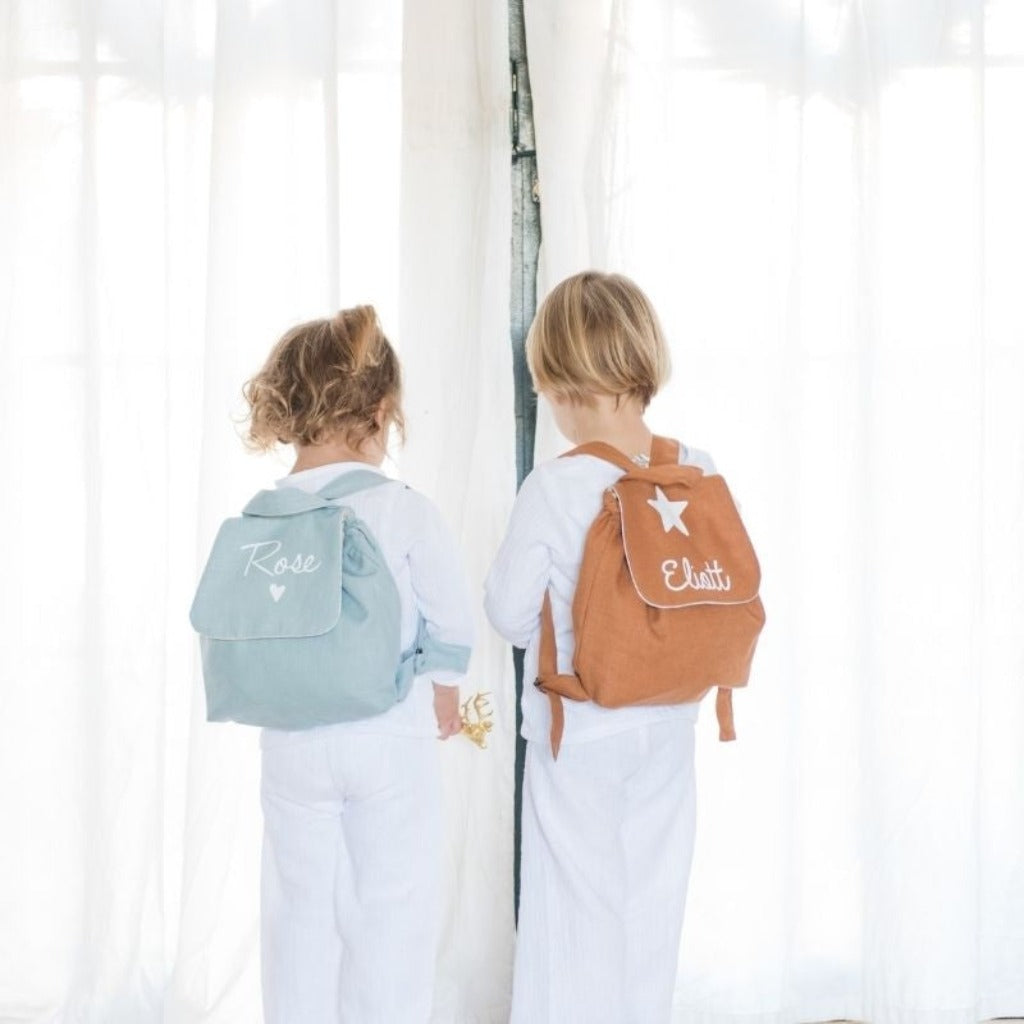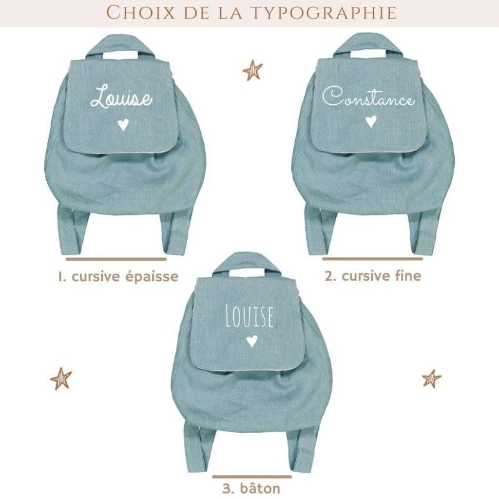 Sac à dos en lin personnalisable avec le prénom de votre enfant. Pratique, il a une ouverture scratch idéale pour les plus petits. Un très joli sac à dos dans lequel on peut transporter un goûter, des affaires de rechanges, une tétine ou un doudou.