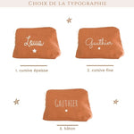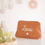 Une ravissante trousse de toilette en lien camel entièrement personnalisable. Une jolie idée de cadeau de naissance.